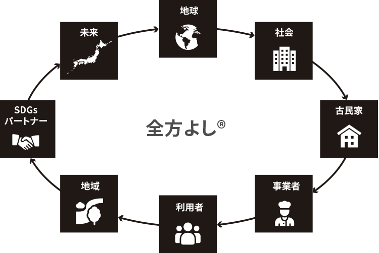 山翠舎はこれからも、古木を通じてSDGsに寄与する新たな価値を提供し、「古民家・古木サーキュラーエコノミー」を推し進めていきます。そのためにめざしているのは、自分たちが手がける設計・施工にも力を入れつつ、古民家・古木の供給者として日本伝統の建築技術の伝承や古民家の魅力を伝える黒子に徹すること。古木の専門工事業の広げていくことです。古木のエンドユーザーであれば発注者として、また同業者であればパートナーとして。古木に興味を持った全員が対象となり、輪のようにつながっていくのです。 そこで求めるのは、発注者として、また協業者としてご協力いただける皆さまです。FSC認証を受けた持続可能な木材である古木を活用することで、発注者はSDGs実践企業にもなれます。