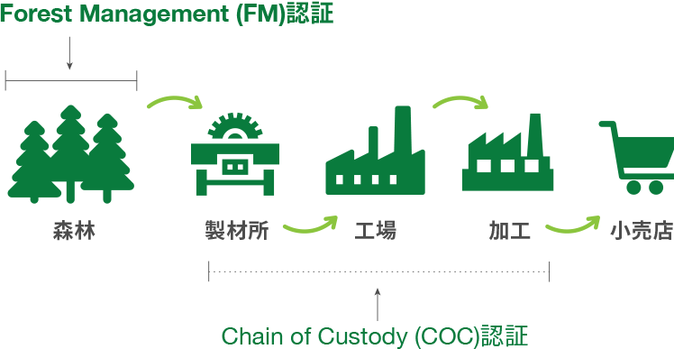 認証には、責任をもって管理された森林の木材であるかを審査するFM(Forest Management)認証と、認証材が消費者の手に届くまでの加工・流通・管理過程を認証するCoC(Chain of Custody)認証があり、山翠舎は後者のCoC認証を取得しました。