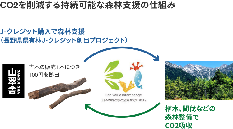 さらに森林を保護し、CO2を削減する取り組みが、古木の販売1本につき100円を拠出する長野県県有林の森林支援です。EVI(プロジェクト・企業・消費者の3者をつなぎ、環境活動に貢献する環境貢献プラットフォーム)を通じてJ-クレジット(CO2などの温室効果ガスの排出削減量や吸収量)を購入することで、カーボン・オフセット(日々の生活でどうしても排除できないCO2など、努力しても削減できない分を植林・森林保護・クリーンエネルギー事業などで埋め合わせすること)を実施。古木を活用することで、過剰伐採が続く発展途上国への植樹や間伐が活性化される仕組みです。