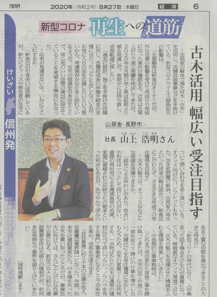 2020年8月27日 信濃毎日新聞 「古木活用 幅広き受注目指す」