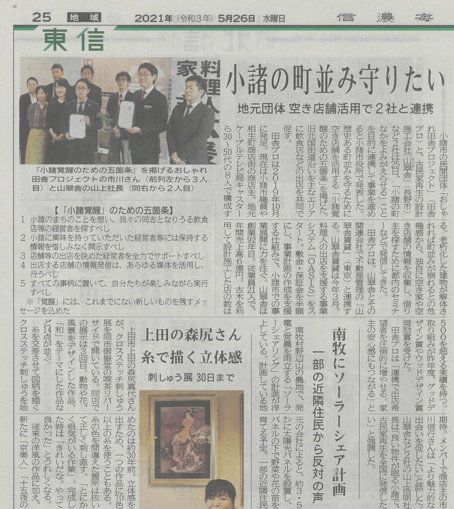2021年5月26日 信濃毎日新聞 「小諸の町並み守りたい ~地元団体 空き店舗活用で2社と連携~」