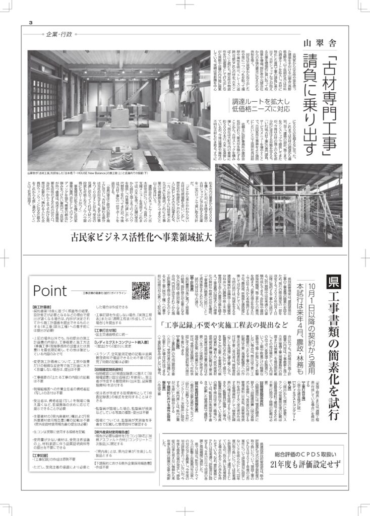 2020年9月25日 新建新聞 「古木専門工事請負に乗り出す ~古民家ビジネス活性化へ事業領域拡大~」