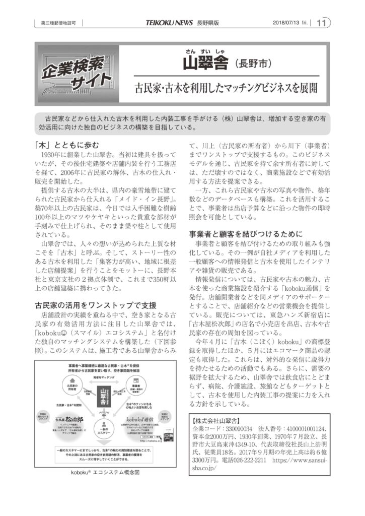 2018年7月13日 TEIKOKU NEWS 長野県版 企業検索サイト 「古民家・古木を利用したマッチングビジネスを展開」